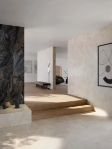 The beauty of semi precious stones, enhanced in a unique design. The elegant and fine interwoven veinages are layered on the different ivory shades, generating a slight movement of great graphic depth. A touch of warmth and harmony in any kind of atmosphere.