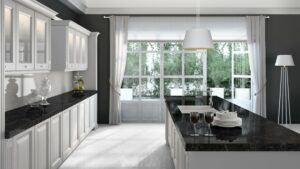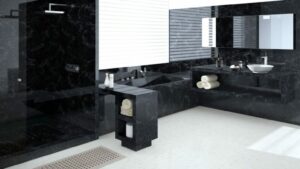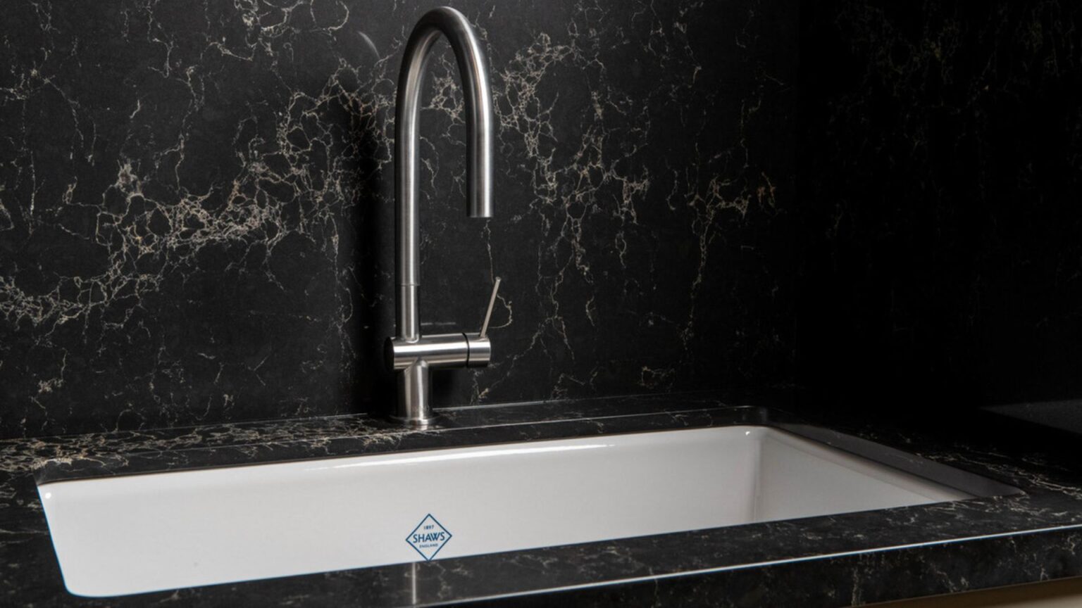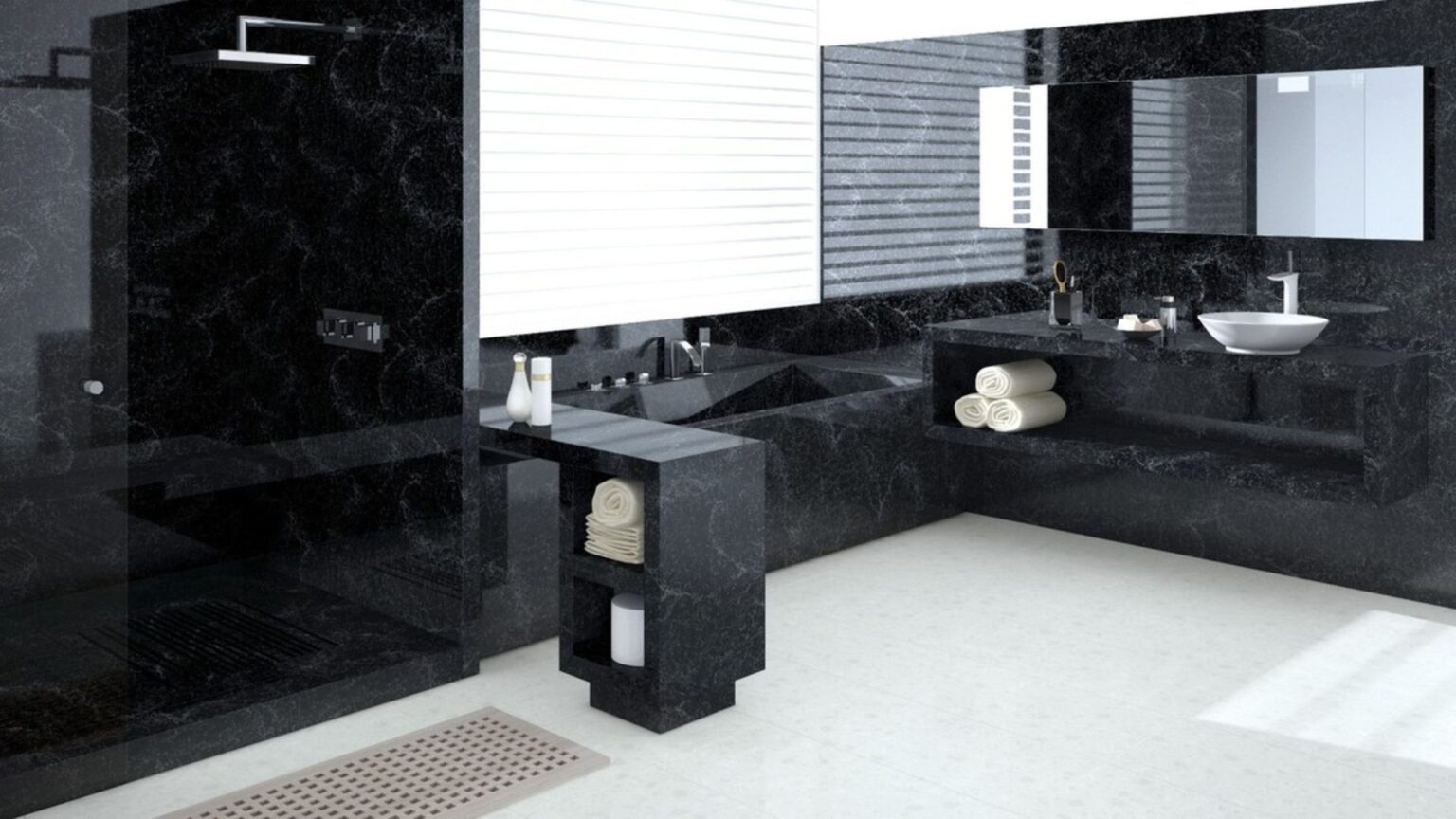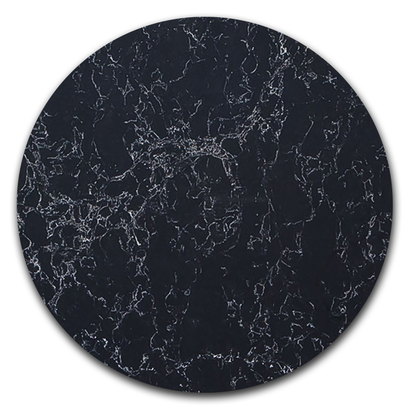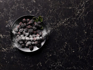 Vanilla Noir quartz from Caesarstone features a rich and luxurious ebony base, washed with expanding creamy vanilla veins and exuding a bold personality.
