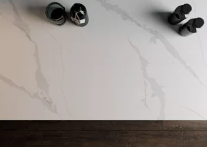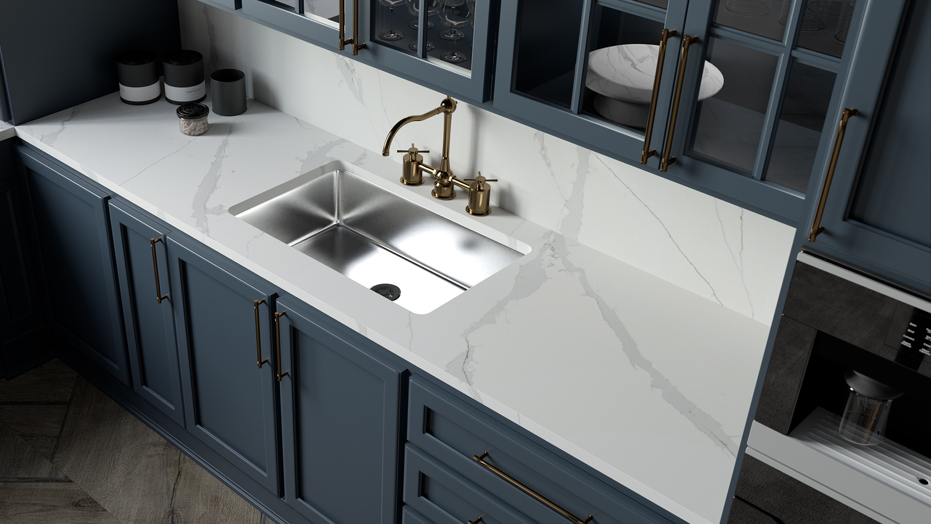 Calacatta Plata quartz from Viatera features widely-spaced silver veins dashing around like a homage to a poetic lightning-filled sky. The thin, minimal veining leaves an ocean of the pristine white that Calacatta is famed for. It angles for attention just so with its striking presence, but with its timeless nature, it is flawless.