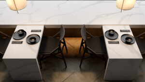 Calacatta Sol quartz from Viatera bestows opulent shades of gold in its large-pattern veins, giving any room a cheerful glow. The striking white infuses your space with abundant brightness. What a perfect backdrop for the twirls of warm hues poking through like sunbeams on a sublime morning.